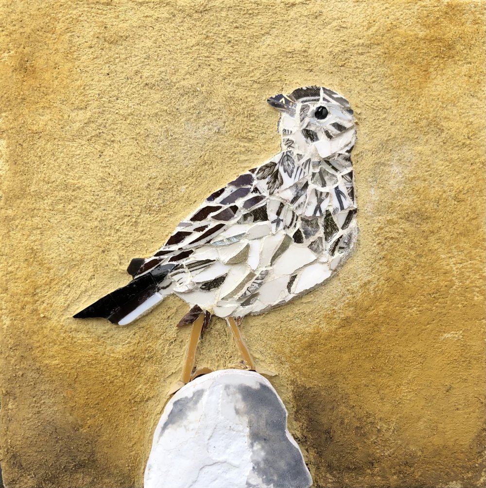 Musvitten. 2025. Indrammet billede i glas og porcelænsmosaik. 15 x 15 cm. Solgt