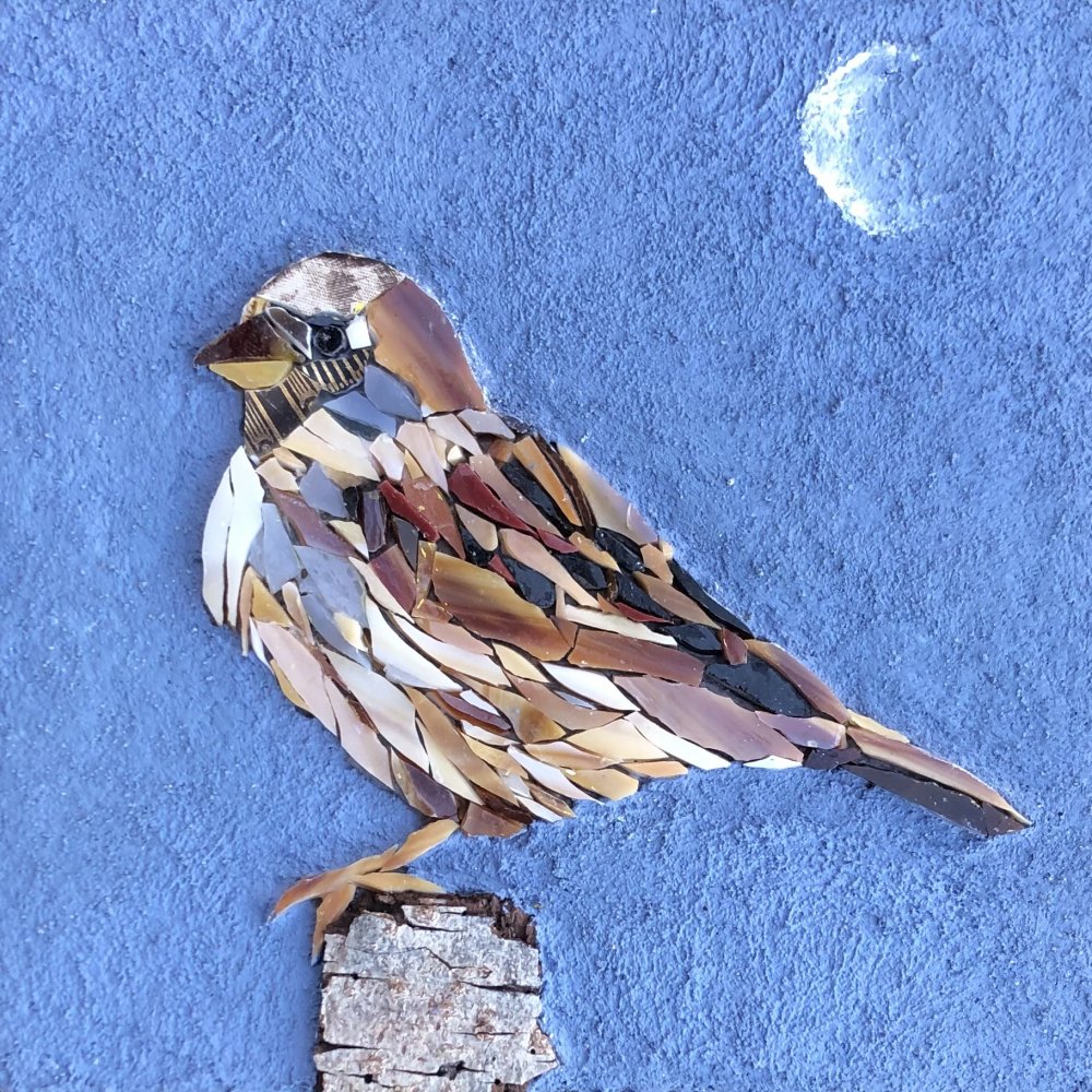 Gulspurv, 2025. Indrammet mosaik billede i glas og træ. 15 x 15 cm. Solgt