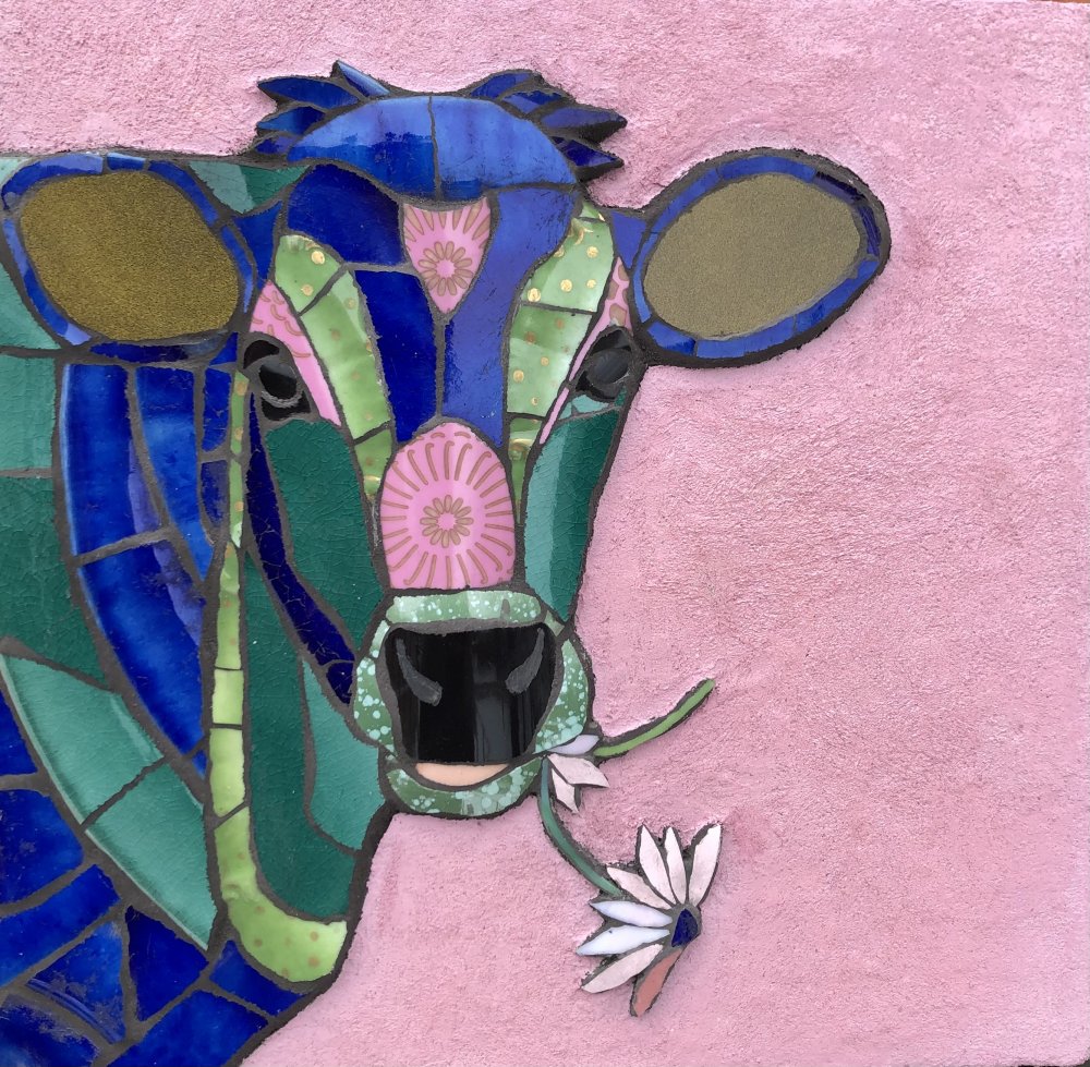 Glad ko, 2020. Billede i genbrugs porcelæn og fliser. 20 x 25 cm. Solgt