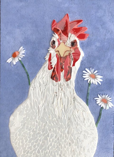 Blomsterhønen, 2025. Indrammet billede i upcycled porcelæn. 30 x 42 cm. 4200 kr.