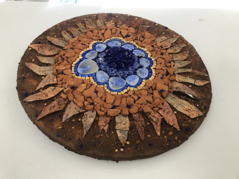 Uden titel, 2026. Smalti, natursten, glas, keramik, mursten. 37 cm. 6.800 kr.