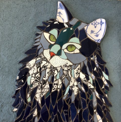 Kat forklædt i porcelæn II. Billede i upcycled porcelæn. 30 x 30. Solgt