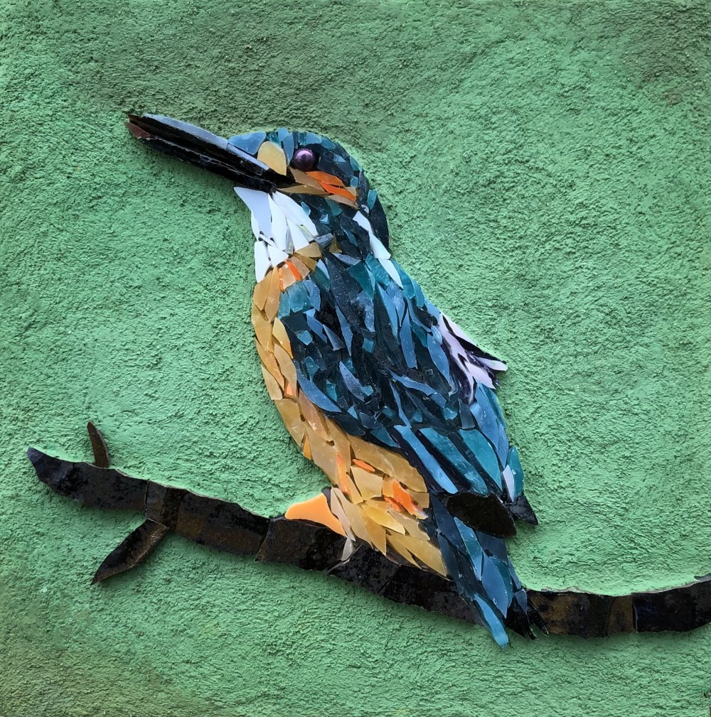 Spætten. 2024. Billede i glasmosaik og træ. 19 x 29 cm. Solgt.